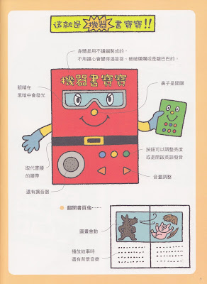 媽媽希望書寶寶成為了不起的圖鑒,但是書寶寶卻希望自己成為厲害的機器書寶寶,就是有不銹鋼製的身體、擴音器、開關,還有音量調整的按鈕,翻開書頁之後,圖畫會動,播放故事時,還有背景音樂呢!