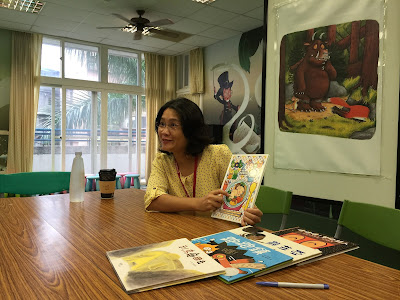在簡短的自我介紹之後,知道我們成員有的有多年的說故事經驗,有的從沒有上台說故事的經驗,有的有帶童軍的經驗,有人的小孩閱讀量和閱讀力已經很棒囉!有人的小孩則不那麼愛閱讀。於是,我和大家分享幾個在國中校園推廣閱讀的方式。